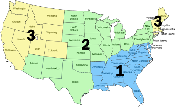 We will ship our carpet, rugs and hard surfaces any where in the continental USA. Use the region map below to help you estimate the cost of shipping your flooring to you. We may select an alternate shipping method for area rugs.